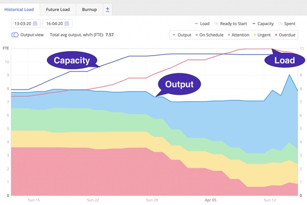 The Planned-Load should be re-calculated every day. The difference between today’s planned load and tomorrow’s is that the orders processed by the resource today disappear from the calculation, while new orders arriving today are added to it. When the Planned-Load of the constraint increases (see the right screen in Picture 2), it means more orders are coming than what the constraint has been able to process. If such a trend is consistent for some time, it might mean: a bottleneck is emerging. You either won’t be able to deliver on time (and suffer customer dissatisfaction), or you will be forced to increase the lead time (and consequently lose some business when your competition remains faster). When the trend goes down (as shown in the left screen in Picture 2), it means less orders are received from the market, and then it is possible to deliver faster.